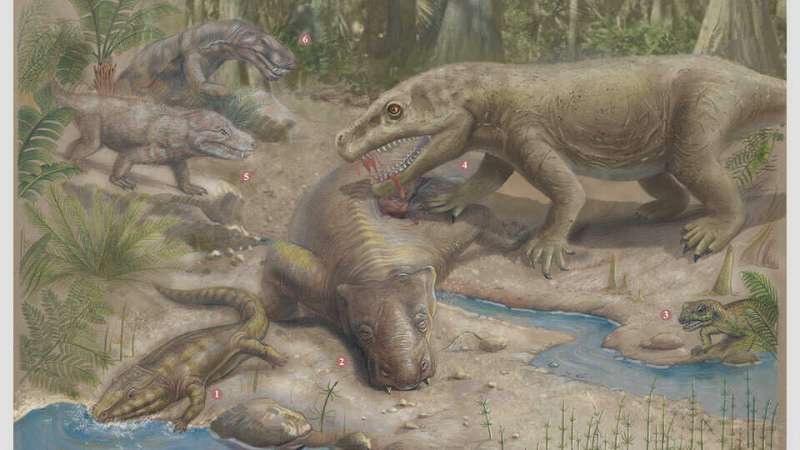 The plant-eating pareiasaurs were preyed on by sabre-toothed gorgonopsians. Both groups died out during the end-Permian mass extinction, or “The Great Dying.” Credit: © Xiaochong Guo