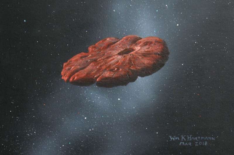 This painting by William K. Hartmann, who is a senior scientist emeritus at the Planetary Science Institute in Tucson, Arizona, is based on a commission from Michael Belton and shows a concept of the ‘Oumuamua object as a pancake-shaped disk. Credit: William Hartmann