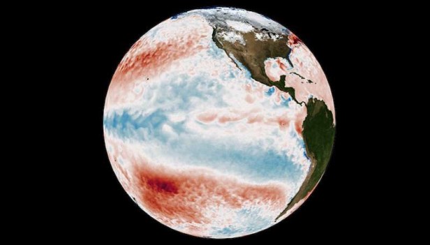 Sea surface temperature anomalies illustrating the current La Niña event (courtesy of NOAA Coral Reef Watch) blended with the NASA January Blue Marble image. Credit: Lawrence Livermore National Laboratory