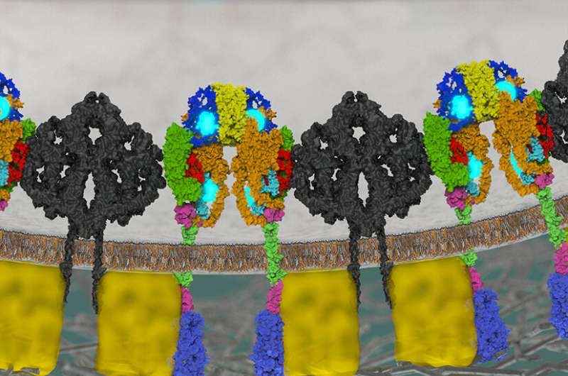 Model of insulin inhibitory receptor ‘inceptor’ (in black) desensetizing the insulin recptor (in color) on a pancreatic beta cell. Insulin in blue. Credit: Helmholtz Zentrum München