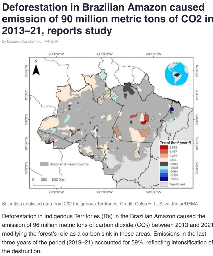 Deforestation in Brazilian Amazon caused emission of 90 million metric tons of CO2 in 2013–21, reports study