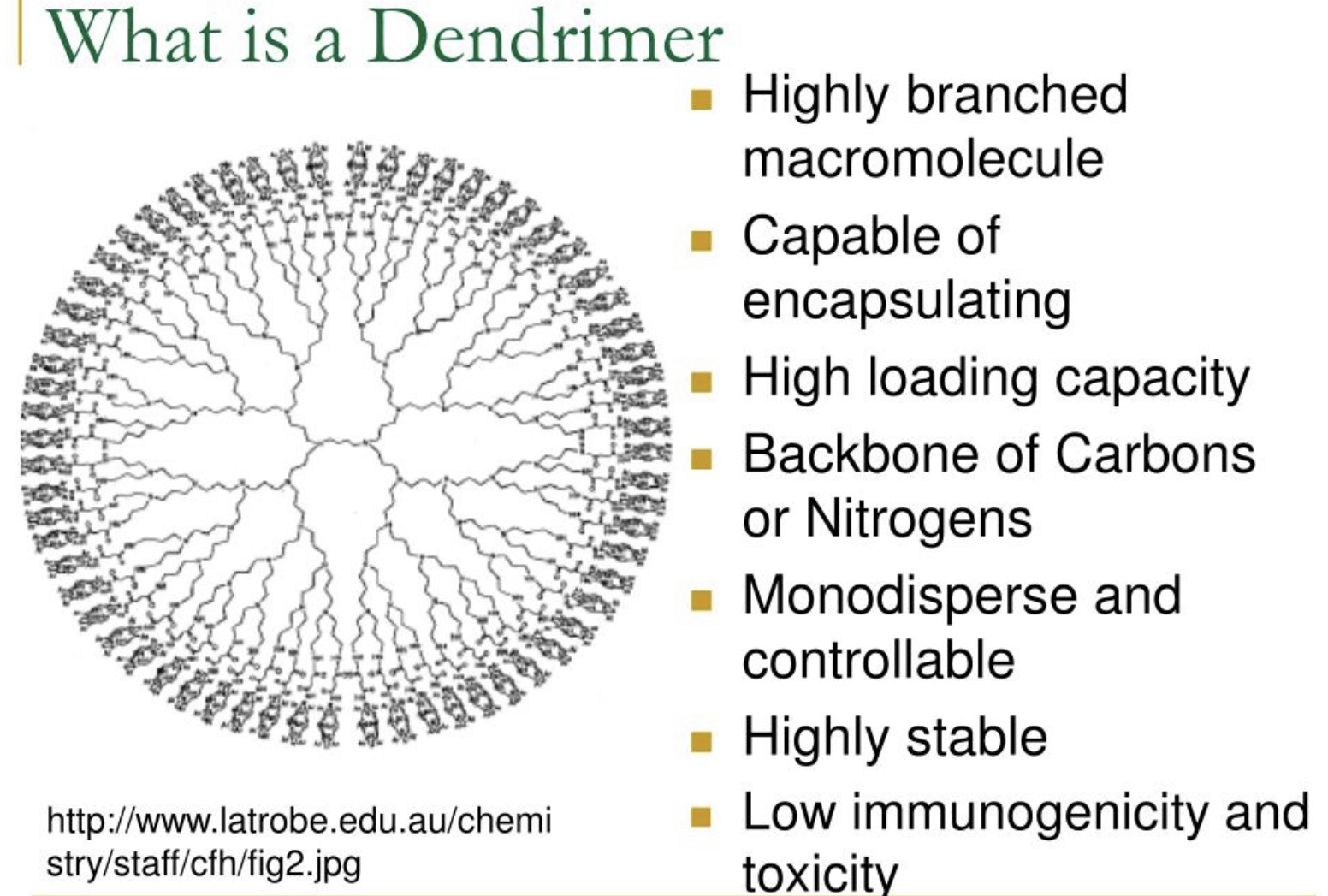 - Drug delivery: dendrimers can improve the solubility, stability and targeted delivery of drugs. They can encapsulate drug molecules within their structure or act as carriers to transport drugs to specific sites in the body.