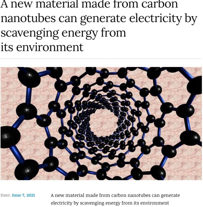 #Education A new material made from carbon nanotubes can generate electricity by scavenging energy from its environment Date: October 18, 2023Author: Wilfredo Santa Gomez,MD wilfredosantagoblog.wordpress.com/2021/06/07/a-new-material-made-from-carbon-nanotubes-can-generate-electricity-by-scavenging-energy-from-its-environment/ WelcomeShare Click to share on X (Opens in new window) X Click to share on X (Opens in new window) X Like Loading... Related