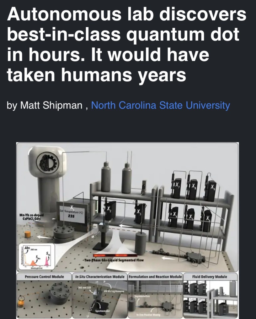 #Education Autonomous lab discovers best-in-class quantum dot in hours. It would have taken humans years Date: January 5, 2024Author: Wilfredo Santa Gomez,MD phys.org/news/2023-11-autonomous-lab-best-in-class-quantum-dot.html WelcomeShare Click to share on X (Opens in new window) X Click to share on X (Opens in new window) X Like Loading... Related
