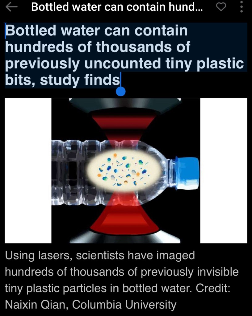 #Education Bottled water can contain hundreds of thousands of previously uncounted tiny plastic bits, study finds Date: January 9, 2024Author: Wilfredo Santa Gomez,MD phys.org/news/2024-01-bottled-hundreds-thousands-previously-uncounted.html WelcomeShare Click to share on X (Opens in new window) X Click to share on X (Opens in new window) X Like Loading... Related