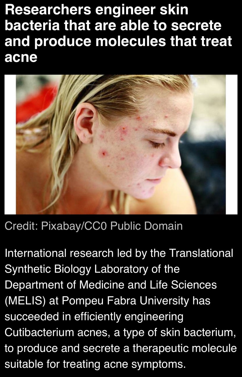 #Education Researchers engineer skin bacteria that are able to secrete and produce molecules that treat acne Date: January 10, 2024Author: Wilfredo Santa Gomez,MD phys.org/news/2024-01-skin-bacteria-secrete-molecules-acne.html WelcomeShare Click to share on X (Opens in new window) X Click to share on X (Opens in new window) X Like Loading... Related