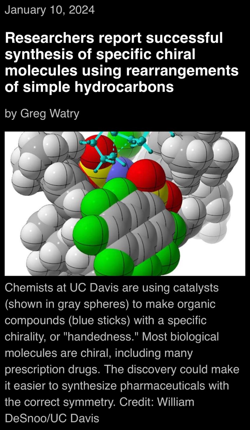 #Education Researchers report successful synthesis of specific chiral molecules using rearrangements of simple hydrocarbons Date: January 10, 2024Author: Wilfredo Santa Gomez,MD phys.org/news/2024-01-successful-synthesis-specific-chiral-molecules.html WelcomeShare Click to share on X (Opens in new window) X Click to share on X (Opens in new window) X Like Loading... Related