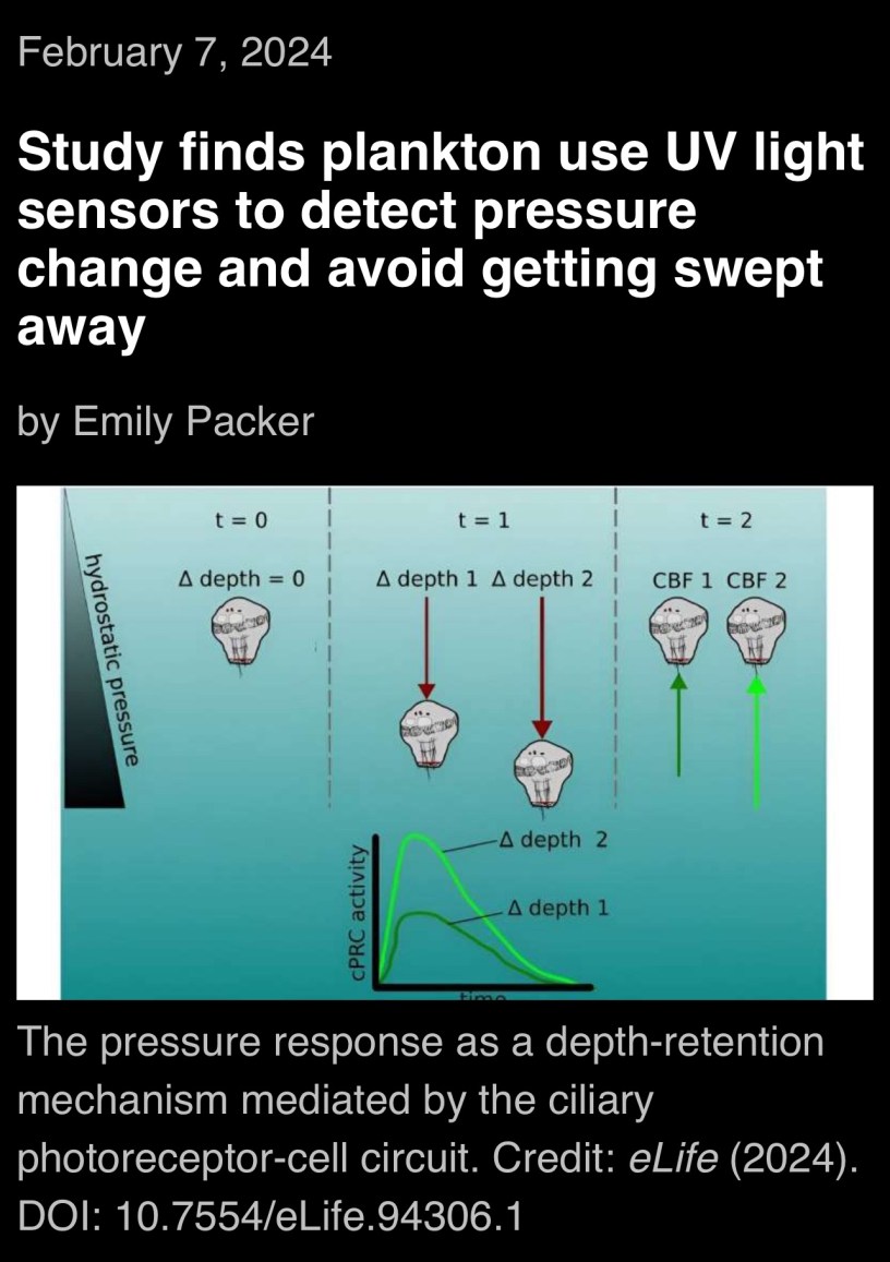 #Education Study finds plankton use UV light sensors to detect pressure change and avoid getting swept away Date: February 7, 2024Author: Wilfredo Santa Gomez,MD phys.org/news/2024-02-plankton-uv-sensors-pressure-swept.html WelcomeShare Click to share on X (Opens in new window) X Click to share on X (Opens in new window) X Like Loading... Related