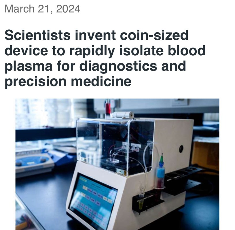 #Education Scientists invent coin-sized device to rapidly isolate blood plasma for diagnostics and precision medicine. Date: March 21, 2024Author: Wilfredo Santa Gomez,MD phys.org/news/2024-03-scientists-coin-sized-device-rapidly.html WelcomeShare Click to share on X (Opens in new window) X Click to share on X (Opens in new window) X Like Loading... Related
