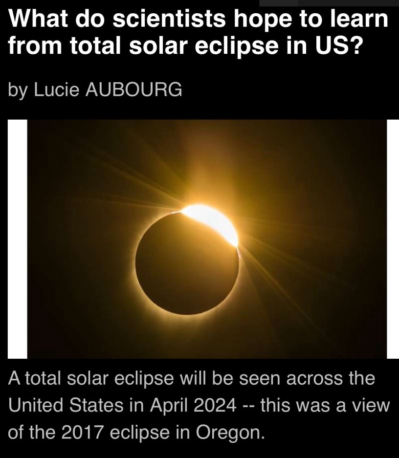 #Education What do scientists hope tolearn from total solar eclipse in US? Date: April 7, 2024Author: Wilfredo Santa Gomez,MD phys.org/news/2024-04-scientists-total-solar-eclipse.html WelcomeShare Click to share on X (Opens in new window) X Click to share on X (Opens in new window) X Like Loading... Related