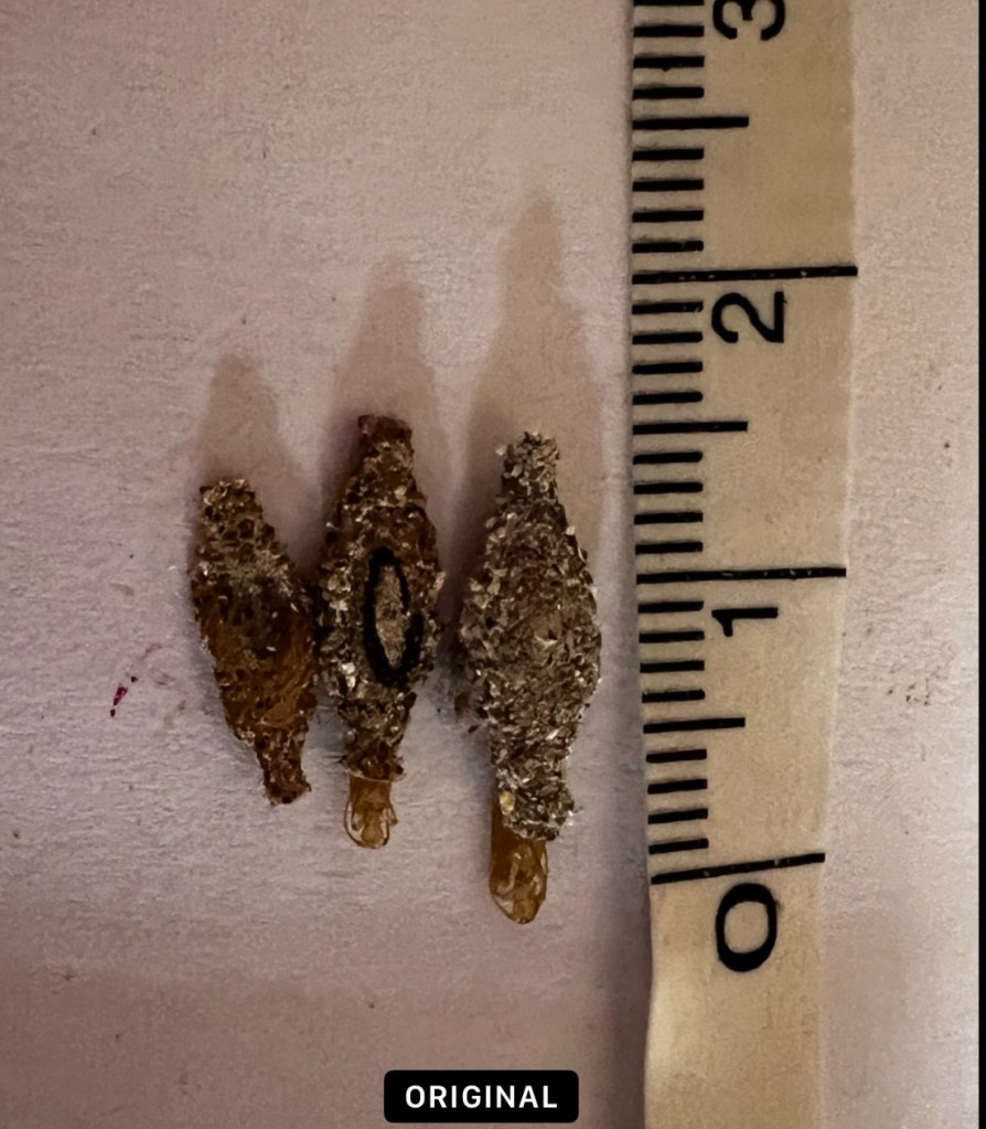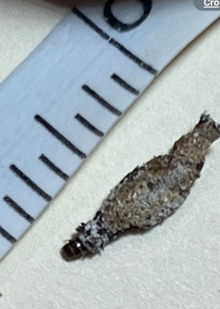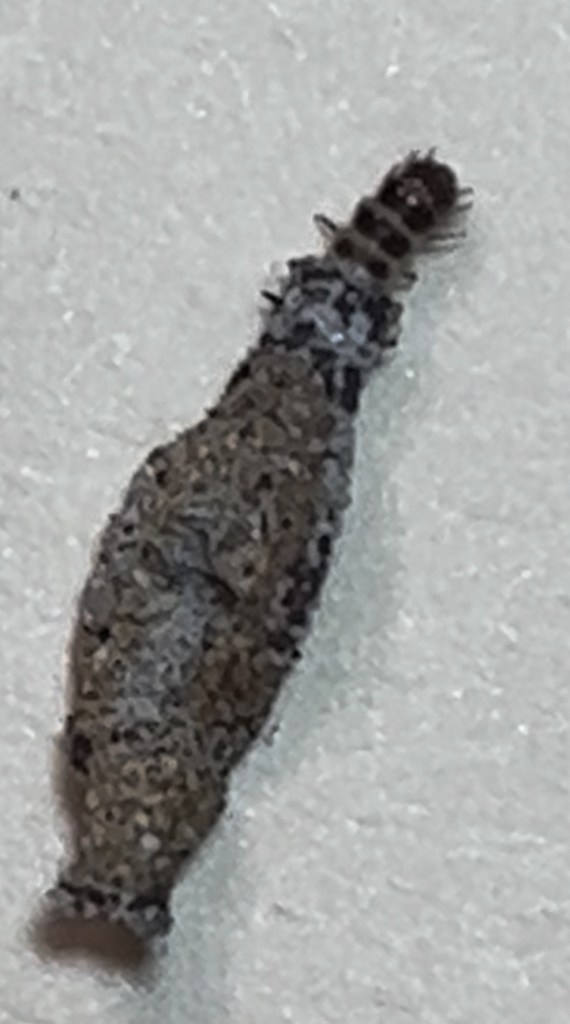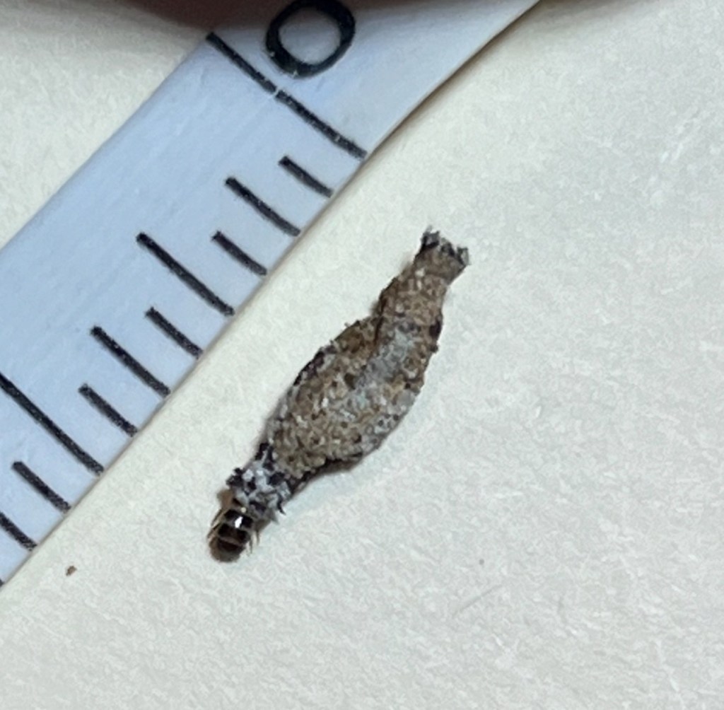 Phereoeca uterella: are small, silver-gray moths with a wingspan of about 10 to 12mm. The adult larvae measured 10 to 12mm long as seen in figure-1 and 2. and 5mm wide. These moths feed on materials like wool, human hair, and feathers, making them potential nuisances but not harmful to humans or pets.