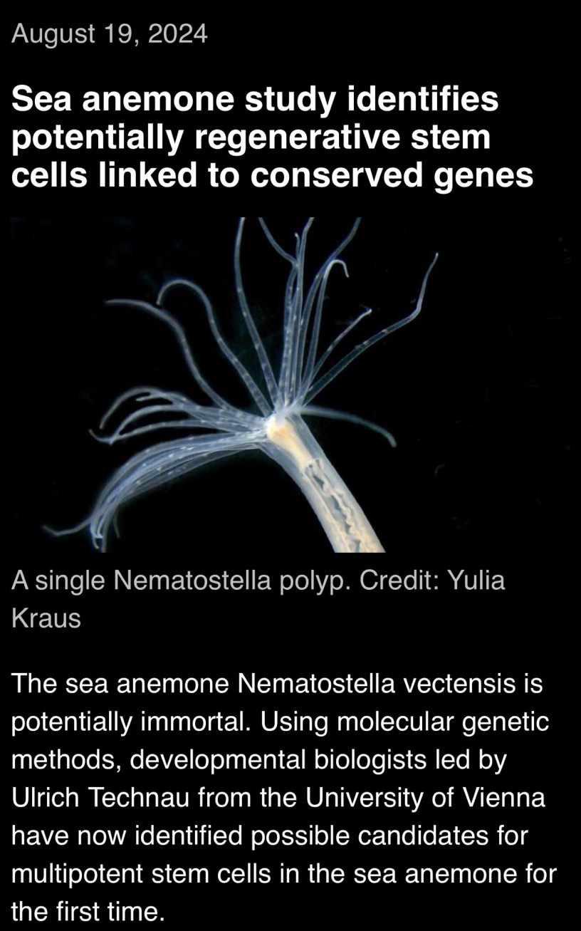 #Education Sea anemone study identifies potentially regenerative stem cells linked to conserved genes Date: August 19, 2024Author: Wilfredo Santa Gomez,MD phys.org/news/2024-08-sea-anemone-potentially-regenerative-stem.html WelcomeShare Click to share on X (Opens in new window) X Click to share on X (Opens in new window) X Like Loading... Related
