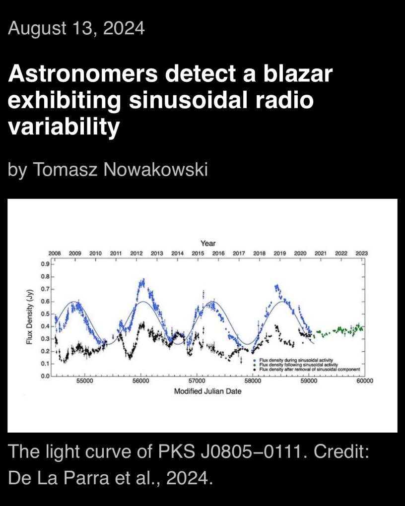 #Education Astronomers detect a blazar exhibiting sinusoidal radio variability Date: November 14, 2024Author: Wilfredo Santa Gomez,MD phys.org/news/2024-08-astronomers-blazar-sinusoidal-radio-variability.html WelcomeShare Click to share on X (Opens in new window) X Click to share on X (Opens in new window) X Like Loading... Related