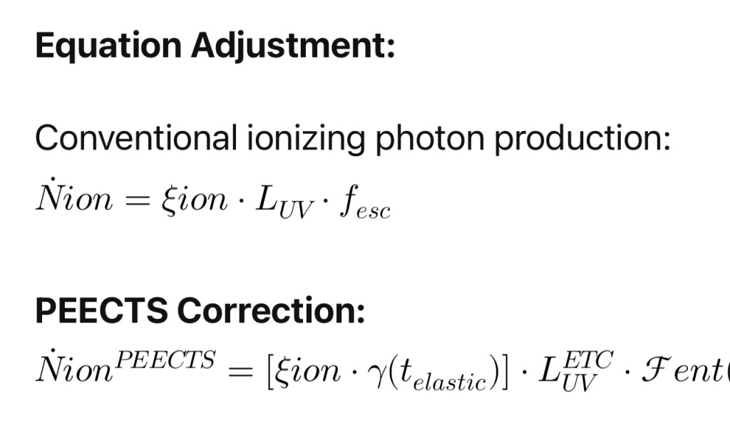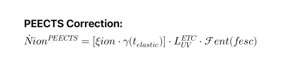 PEECTS Correction:N˙ionPEECTS=[ξion⋅γ(telastic)]⋅LUVETC⋅Fent(fesc)N˙ionPEECTS=[ξion⋅γ(telastic)]⋅LUVETC⋅Fent(fesc)