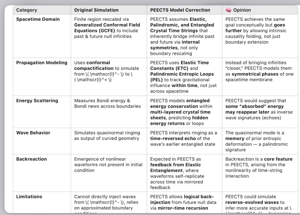 🧮This paper is a breakthrough in simulating the full past-to-future gravitational wave journey through black hole spacetime. Let’s now compare and reframe it entirely using PEECTS model corrections, in a structured and rigorous way.
