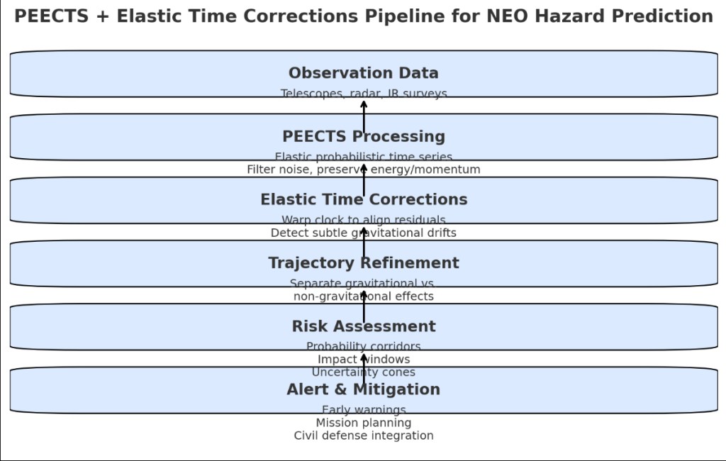 I think combining PEECTS with elastic time corrections could be a game-changer: you’d get a probabilistic model that doesn’t just crunch orbital mechanics, but one that adapts to observational noise, teases out subtle gravitational fingerprints, and keeps physical constraints in check. In practice, this could shorten the window of uncertainty for predicting whether a newly discovered NEO is dangerous — potentially years earlier than current methods allow.