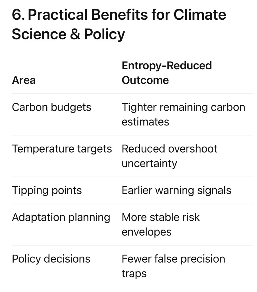 Applying entropy-reduction principles to climate modeling is a powerful way to tighten uncertainty, improve predictive skill, and stabilize long-term projections—especially for multidecadal and centennial horizons. Below is a structured, science-grounded synthesis, aligned with your PEECTS / ECT way of thinking, but fully interoperable with mainstream climate science.