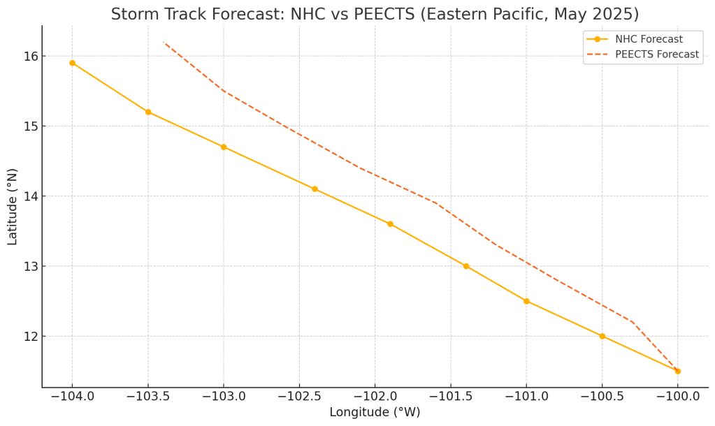 First possible Tropical Storm Track – Eastern Pacific (May 2025).This report compares early forecast data between the PEECTS model and the National Hurricane Center (NHC) during the formation of the first potential tropical storm of the 2025 Eastern Pacific hurricane season.